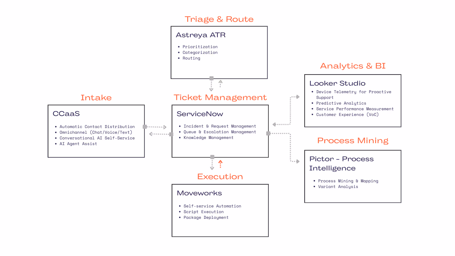 By integrating world-class Customer Support Engineers, ServiceNow ITSM, Moveworks AI Automation, Looker Studio, CCaaS platforms, and Pictor, Astreya transforms IT support from a cost center into a business velocity enabler.